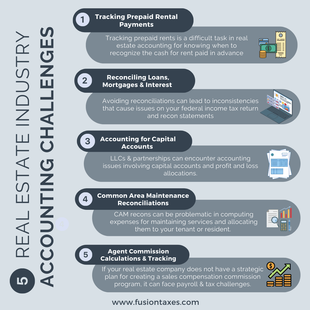 Tracking prepaid rents is a difficult task in real estate accounting for knowing when to recognize the cash for rent paid in advance. This ties directly into the accounting method a real estate business uses. It is important to understand how to account for advance rent payments and keep the method consistent throughout. Using different accounting methods i.e. cash-based accounting for some, and accrual accounting methods for others will only cause a mess in your accounting which could lead to challenges with the IRS.Getting your accounting software set up in a way that will track and process early and timeous payments correctly will help maintain the validity of your financial statements and tax reports.2. Reconciling Loans, Mortgages, and Interest Payments