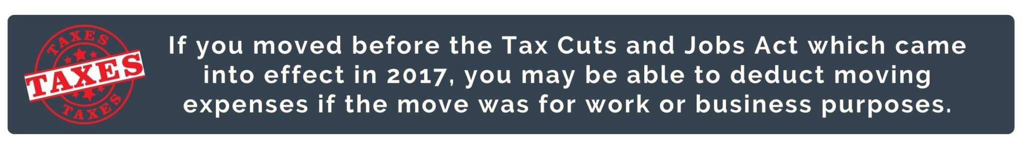 If you moved before the Tax Cuts and Jobs Act (TCJA) which came into effect in 2017, you may be able to deduct moving expenses if you moved for work or business purposes. But after 2018, moving expenses are no longer considered tax deductible for most individuals. Only those with the following exceptions to the general rule may still be eligible for this deduction: