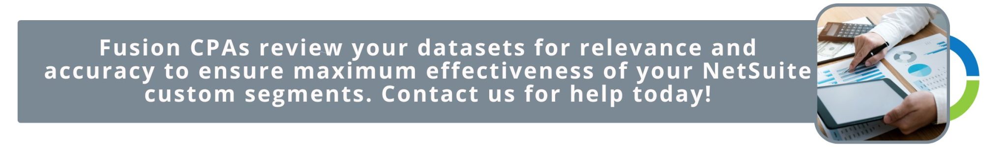Fusion CPA plays a crucial role in maximizing the effectiveness of your NetSuite custom segments. Our NetSuite-certified CPAs have solid expertise in the software’s functionality, ensuring correct software integration to drive key insights. We can help you keep your reporting optimized and relevant. Contact us for assistance today!