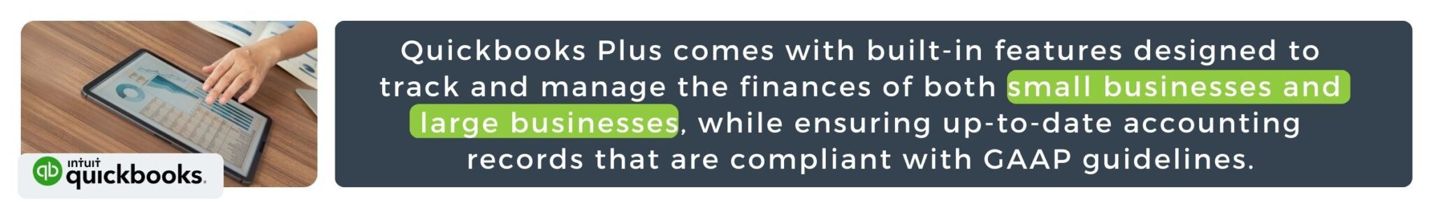 Quickbooks Plus is a comprehensive accounting software for small businesses. It comes with built-in features designed to track and manage the finances of both small businesses and large businesses, while ensuring accurate and up-to-date accounting and bookkeeping records that are compliant with GAAP and IRS requirements.