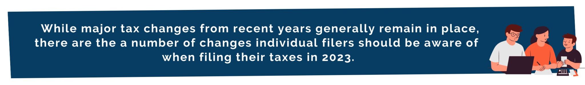 The US tax system is constantly evolving and still adapting to multiple tax changes that took place to provide economic relief to individuals and businesses during the COVID-19 pandemic. While major tax changes from recent years generally remain in place, including lower income tax rates, larger standard deductions, and more, there are a number of changes that take effect to aid the nation to return to pre-COVID tax rules. These are the tax changes that individual tax filers of 2023 should be aware of when preparing their taxes.