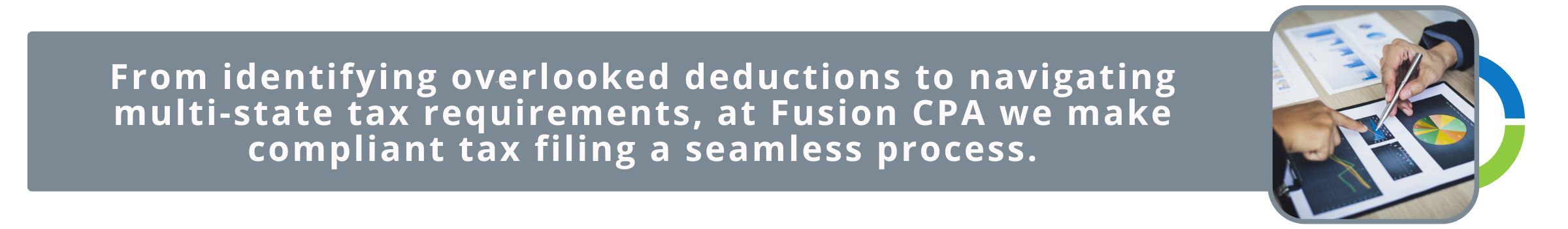 At Fusion, our CPAs specialize in compliant tax filing. From identifying overlooked deductions to navigating multi-state tax requirements, we’re here to make the process seamless. Contact us for help today!
